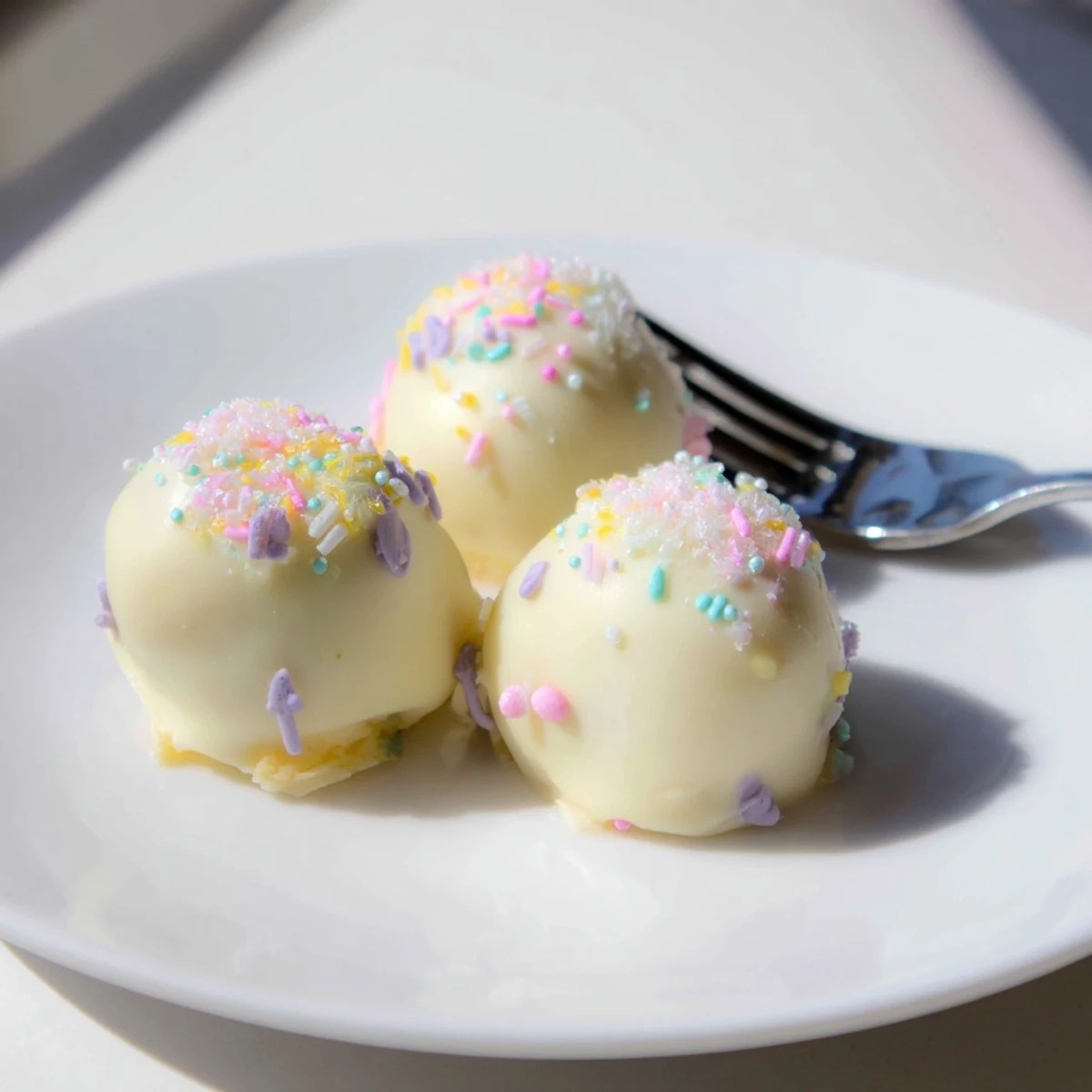 - Dip each chilled truffle into the melted chocolate letting excess drip off then immediately add Easter sprinkles before the coating sets. Work quickly because the chocolate firms up fast.
