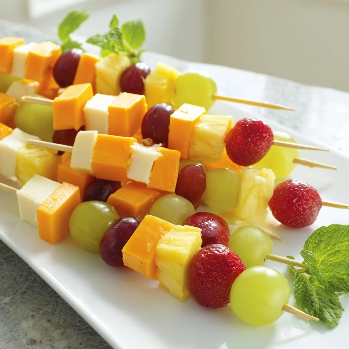 Cantaloupe and honeydew melon pair beautifully with cheddar. Kiwi adds bright acidity and visual appeal. Apple slices work well—just dip them briefly in lemon juice to prevent browning. Berries like blueberries or blackberries add gorgeous color. Choose fruits that hold their shape when skewered for the best presentation.