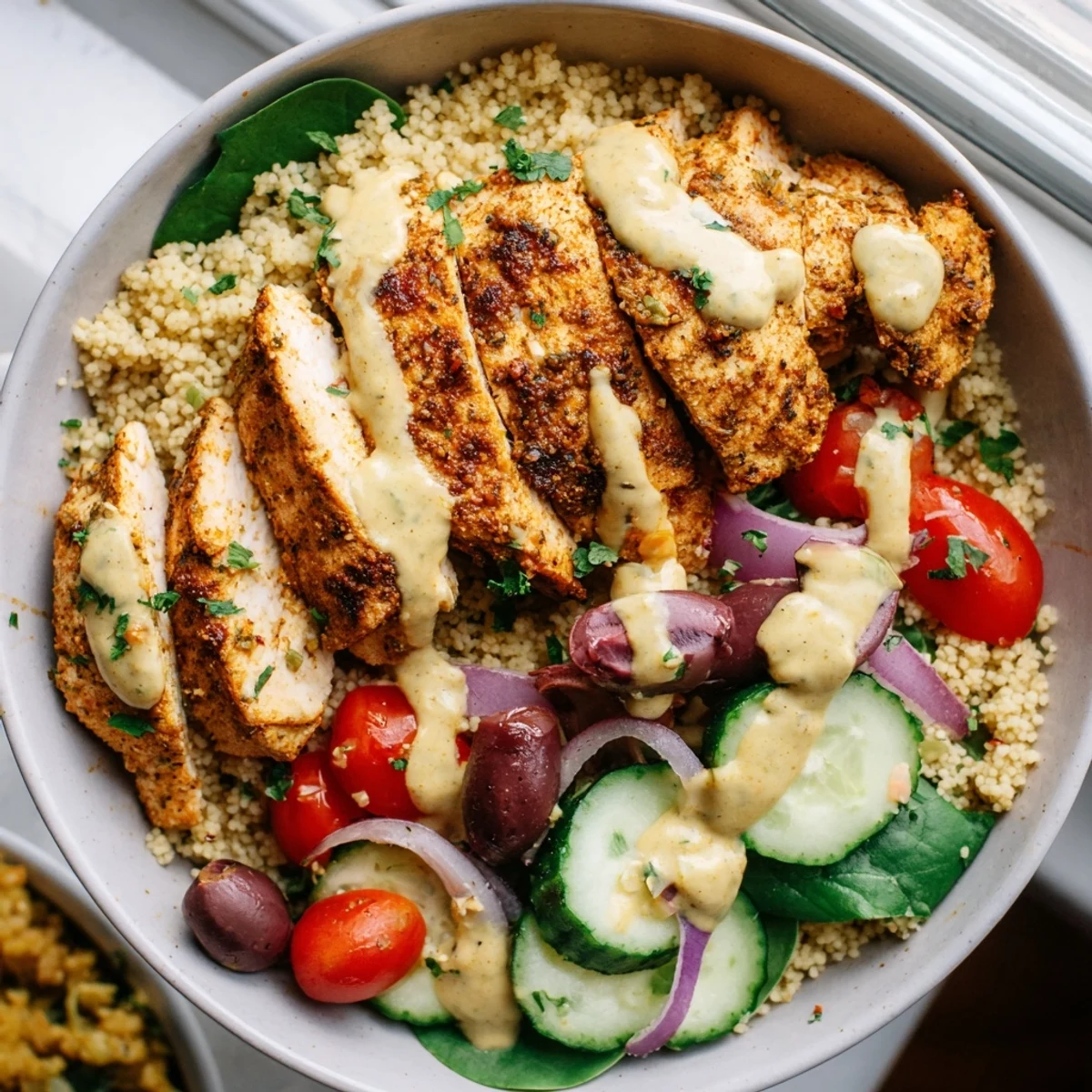 This satisfying bowl brings together Mediterranean-spiced chicken, light and fluffy couscous, and an array of fresh vegetables including cherry tomatoes, crisp cucumber, Kalamata olives, and peppery arugula. The star is the creamy lemon-tahini sauce that ties everything together with its bright, tangy finish.