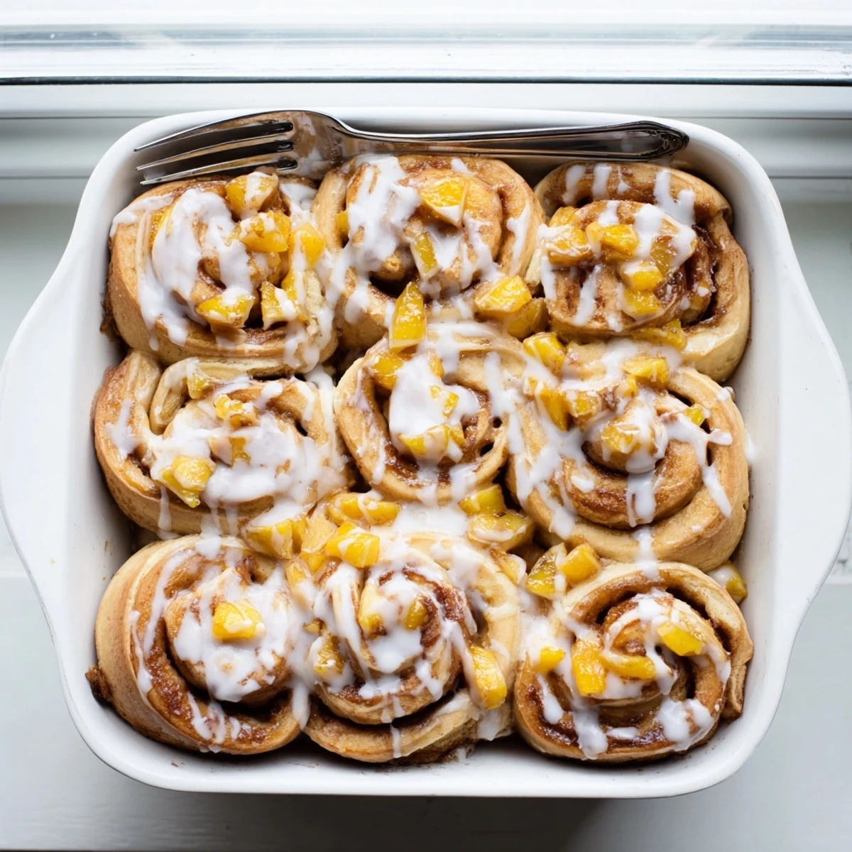 These soft, pillowy cinnamon rolls combine the comforting flavors of peach pie with classic cinnamon roll goodness. Fresh peaches are simmered with brown sugar, cinnamon, and nutmeg until thick and luscious, then spread across a buttery dough alongside cinnamon sugar. After baking to golden perfection, a creamy vanilla glaze is drizzled over the warm, fluffy rolls for the ultimate finishing touch.