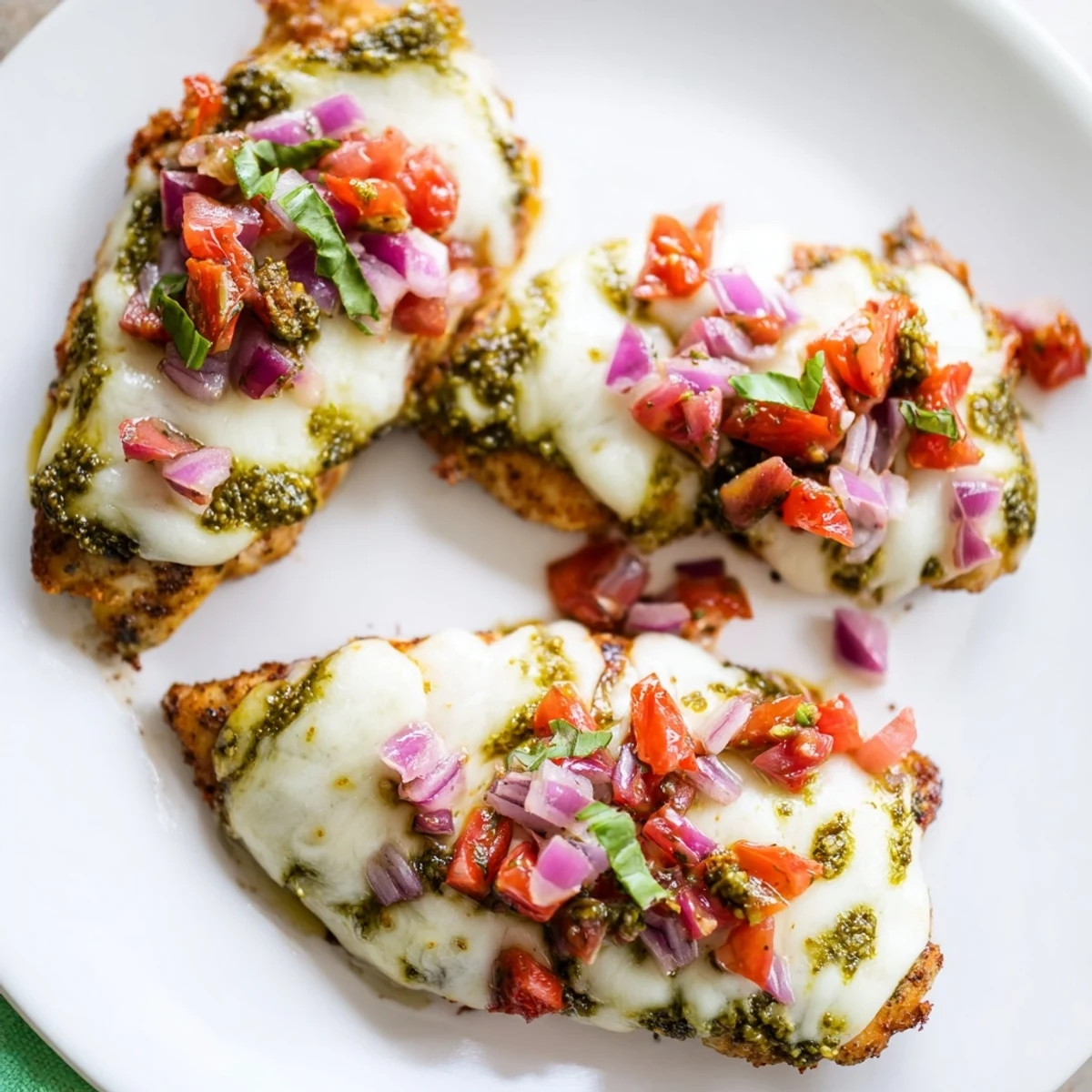 This chicken dish combines tender baked breasts with classic Italian flavors. The pesto adds aromatic basil and garlic notes, while the bruschetta topping brings juicy tomatoes, tangy balsamic, and fresh herbs. Melted mozzarella ties everything together into a satisfying main course that's perfect for busy weeknights.
