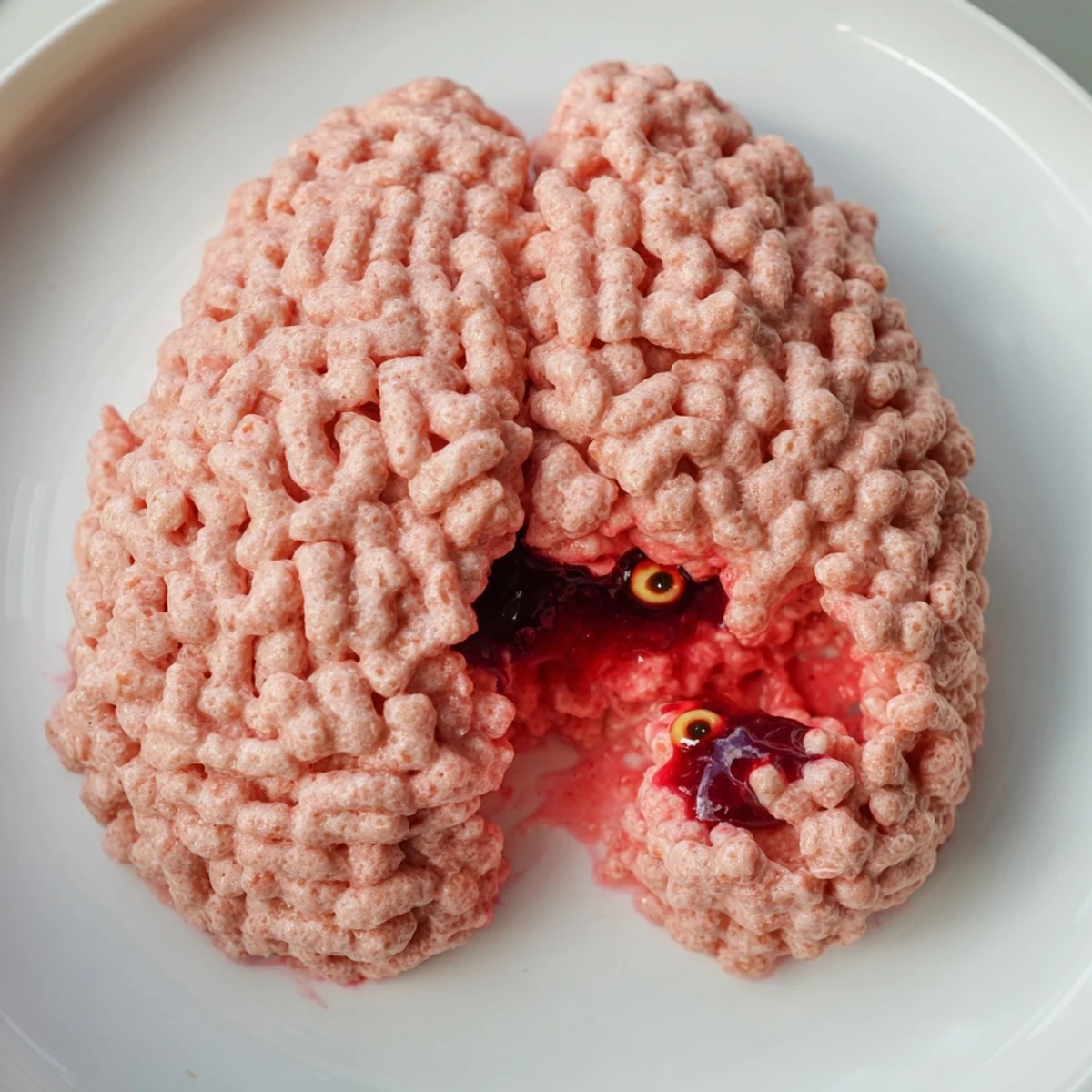 This delightfully creepy Halloween dessert transforms classic crispy rice treats into an edible brain shape with a surprise gooey berry filling inside. The marshmallow-coated cereal gets a pinkish brain-like hue before being pressed around a center of raspberry or strawberry jam that oozes out dramatically when sliced.